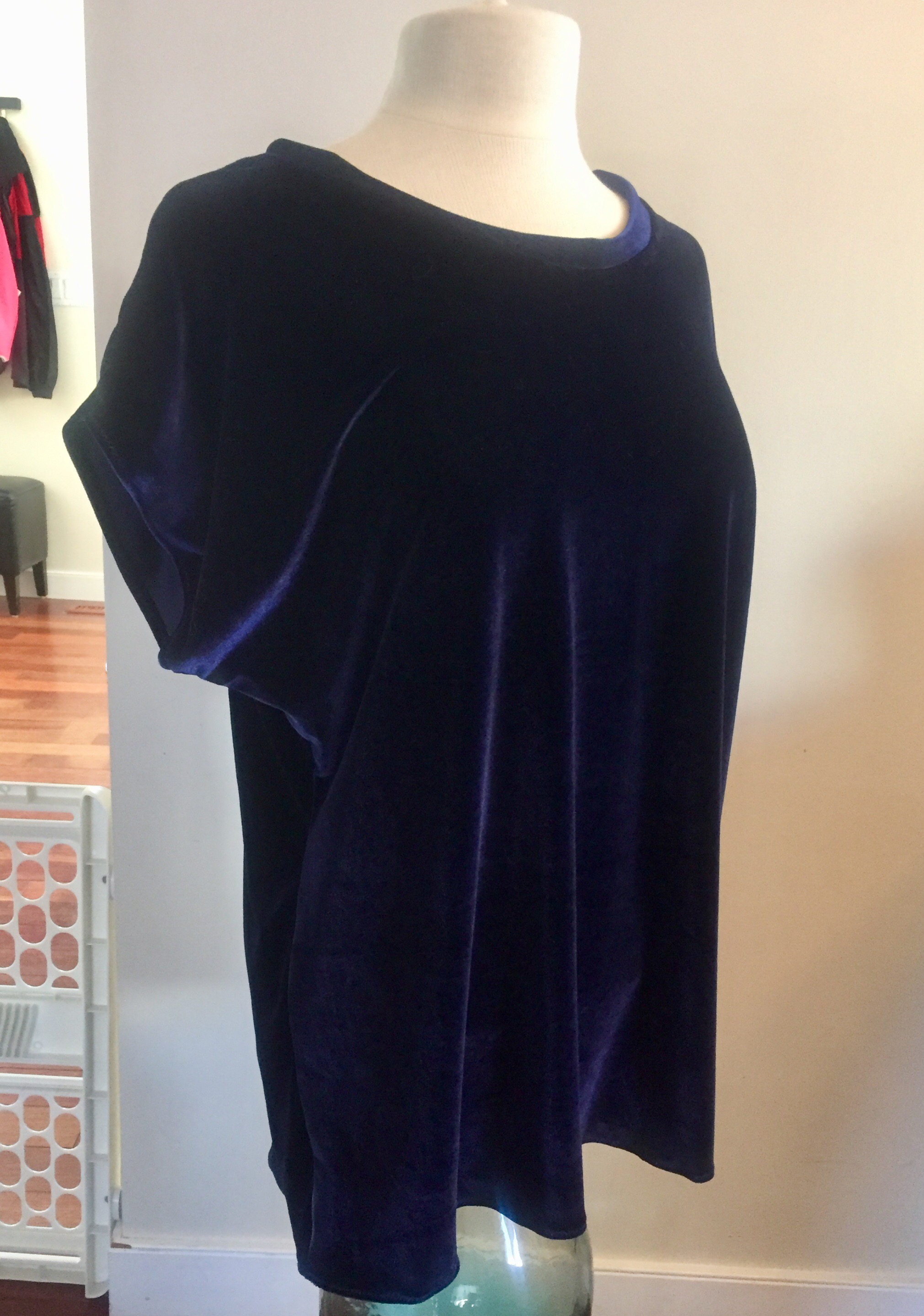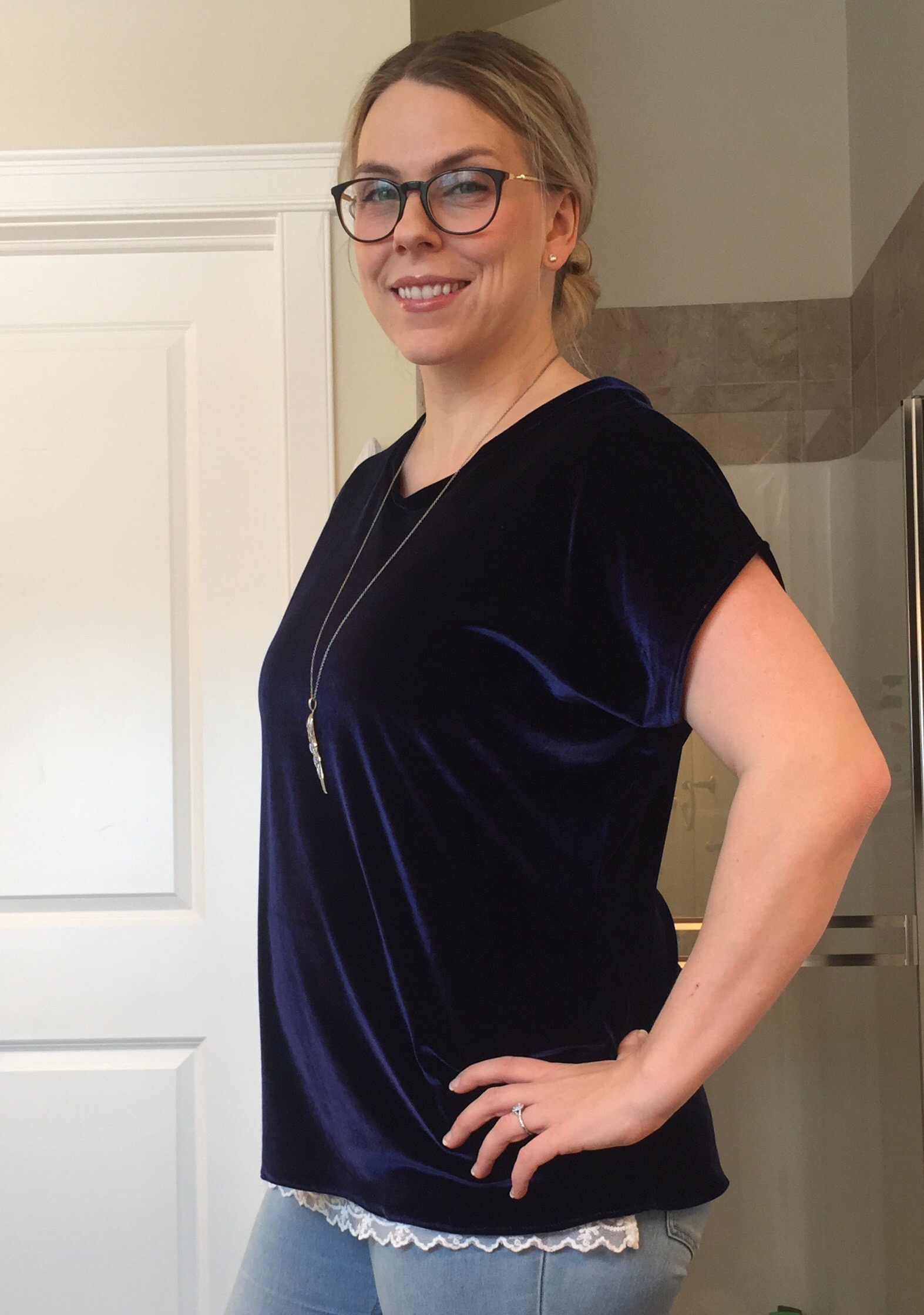 While browsing Pinterest, I started noticing a lot of stretch velvet tops and dresses. I fell in love with a navy stretch velvet t-shirt. Of course, the model and I have different body types and she likely did not have a 12 pound 10 ounce baby three months ago (not many people have!). That said, I know that it’s not going to look exactly the same on me, and I needed a pattern that will work now and also when I’m back to pre- pregnancy weight. I decided on the Blanc Tee from Blank Slate Patterns. I sized up to get more drape. I found a .7 metre remnant of navy stretch velvet from my local fabric store. Tip – join the Blank Slate Pattern group on Facebook and check the files to get this pattern for free!
